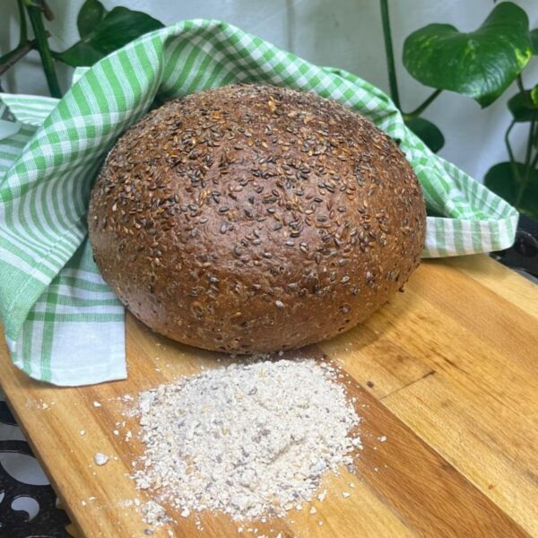 Pagnotta fatta con farina integrale, farina di malto d’orzo tostata, crusca, sesamoIngredienti:glutine di frumentoproteine di soiaproteine di lupinigrani di soiasemi di linosemi di girasolefarina integrale di frumento crusca di frumentofibra di melasesamosalefarina di malto d’orzo tostatalecitina di soiapagnotta gr 500