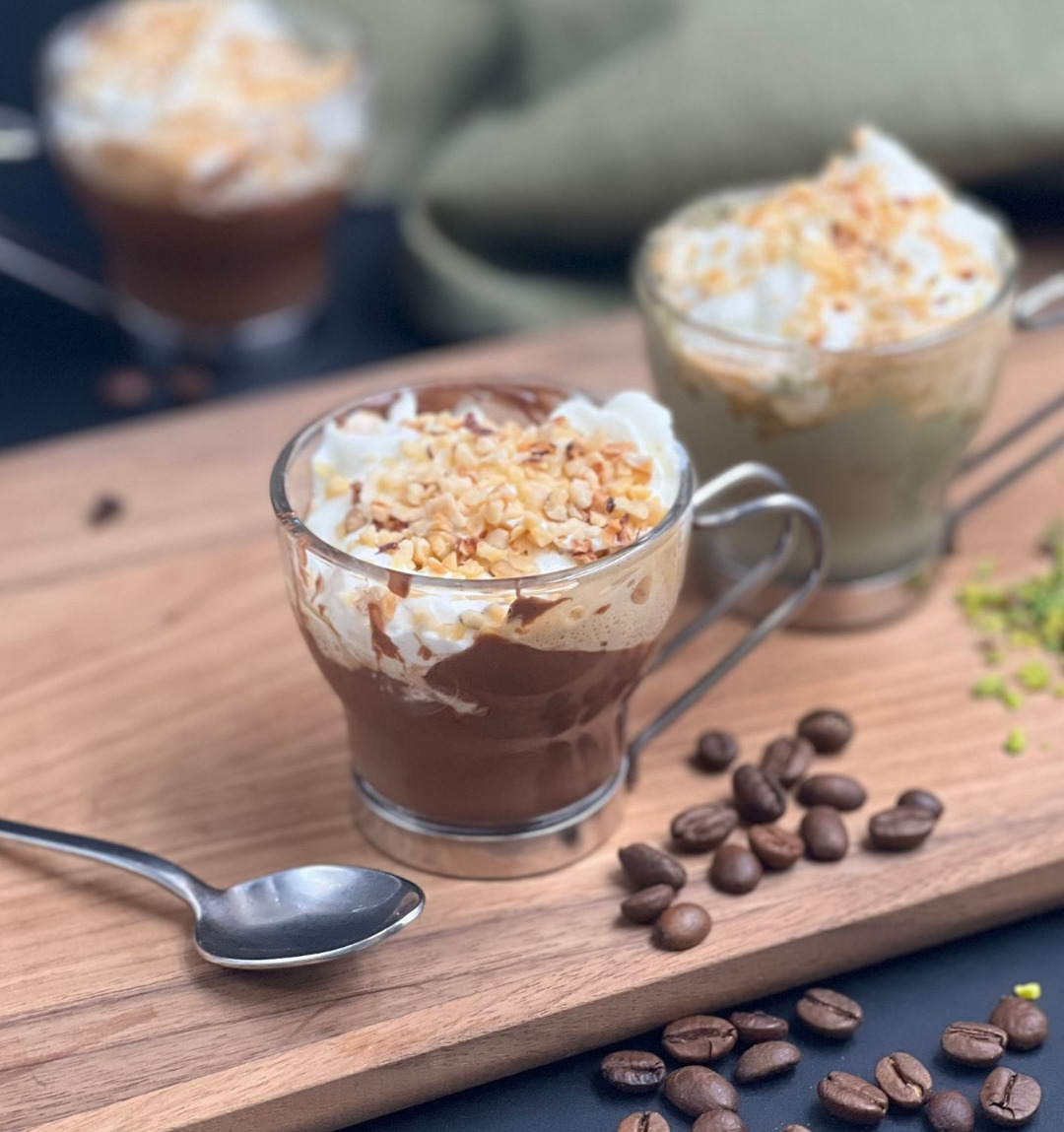 L’aroma deciso del caffè incontra la delicatezza della panna e della crema al pistacchio o crema nocciola, entrambe vegetali, in un equilibrio perfetto di dolcezza e croccantezza. Rifinito con granella di nocciole tostate.